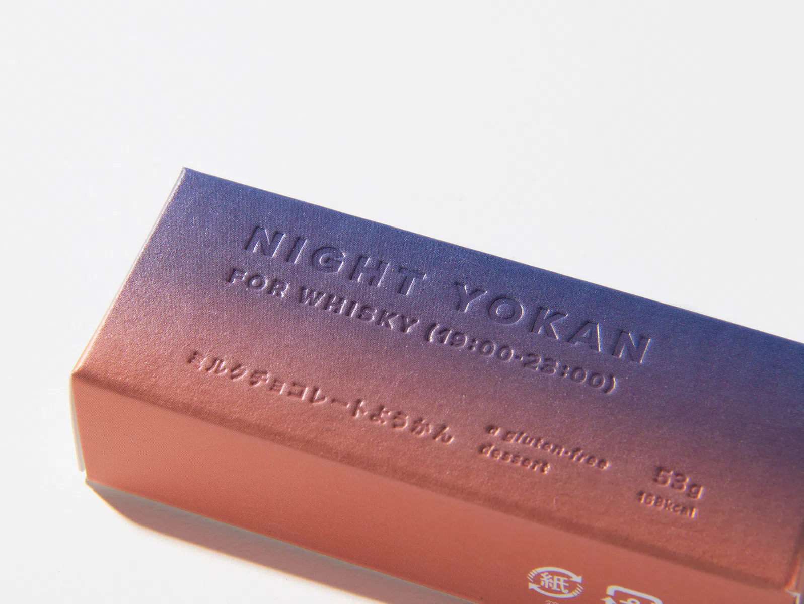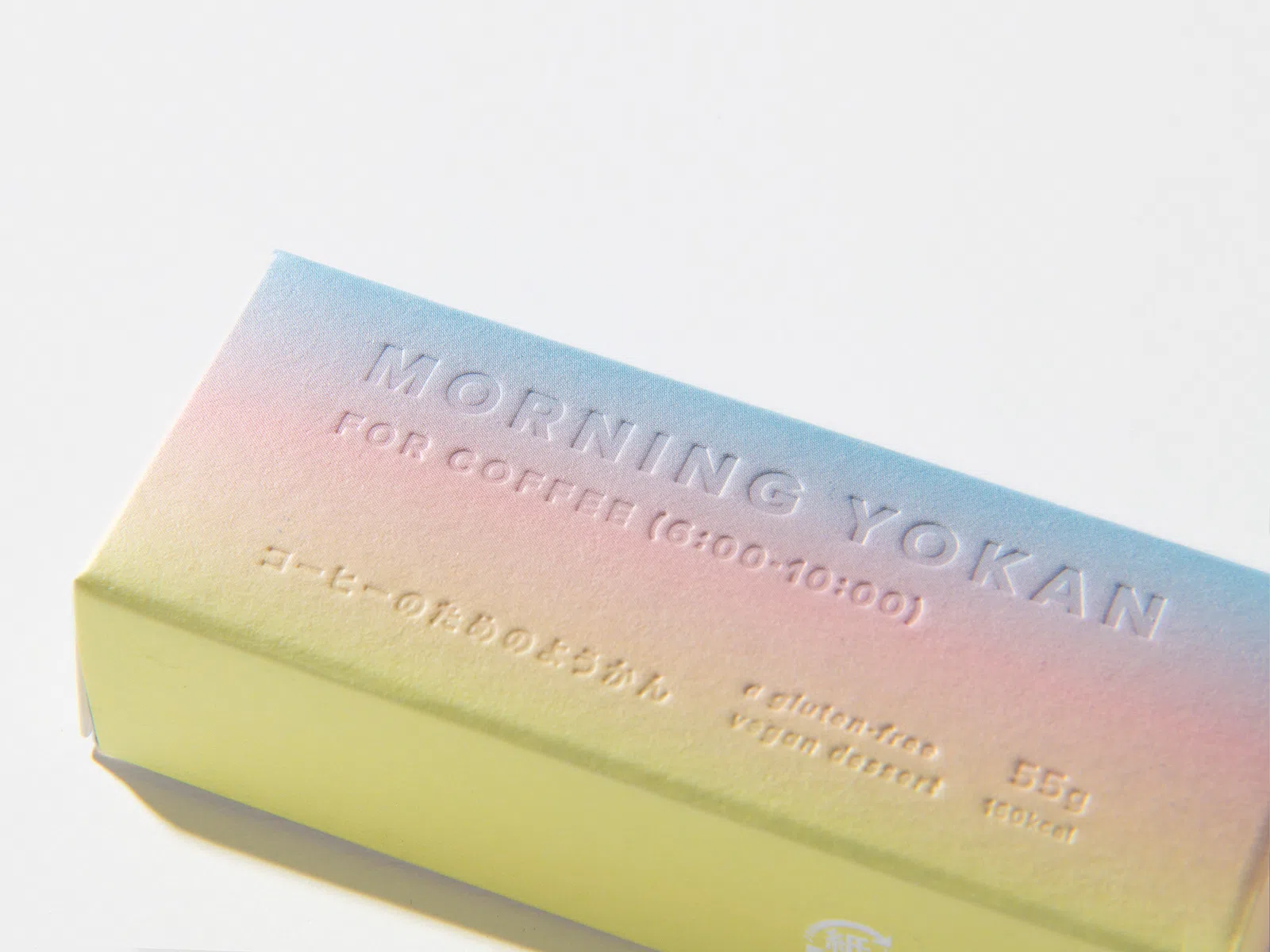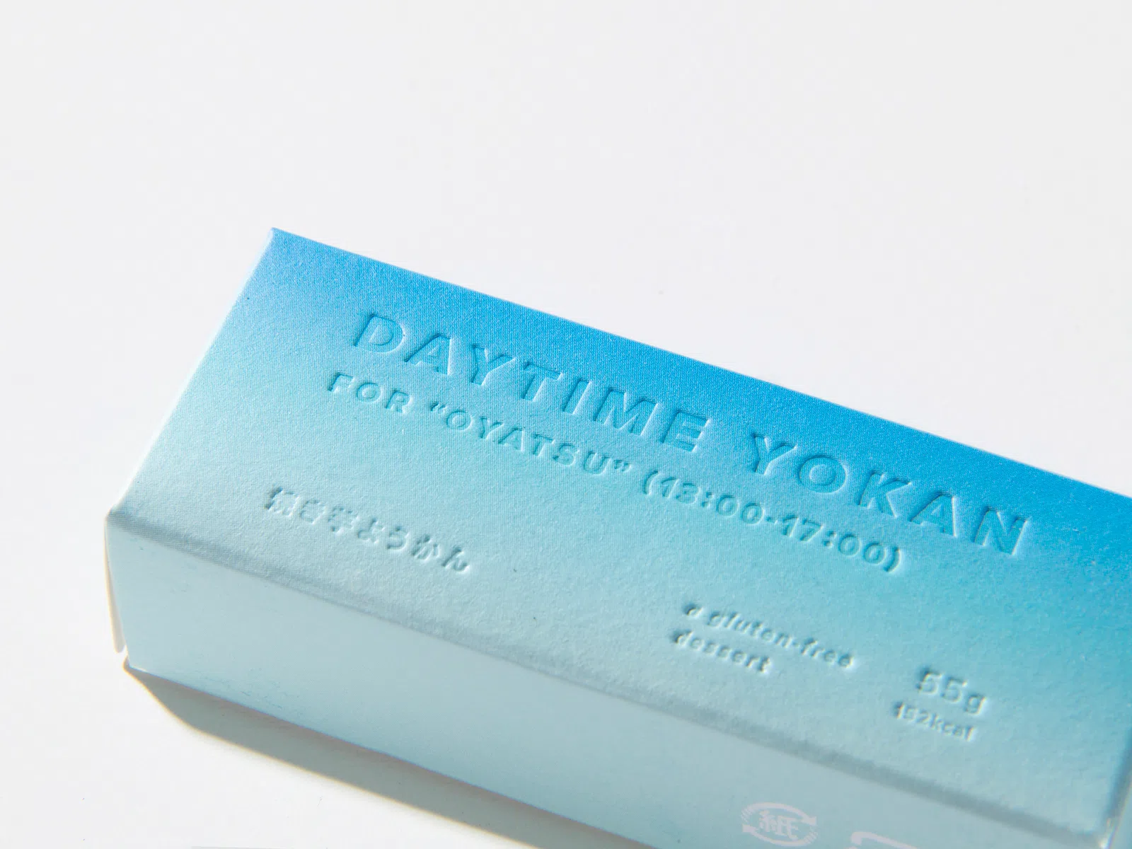 注目を浴びている「アウトドア」。その際に気軽に持って行ける羊羹を提案し、商品化しました。アウトドアで過ごす「時間」に着目し、時間帯の「空の移り変わり」をグラデーションで表現。デザインのポイントは空の色を綺麗に表現すること。そして商品テキストが空の色の邪魔をしないようにインキをのせずデボス加工を用いる点。その2つのポイントを可能にする「気包紙 C-FS」を採用しました。(サノワタルさん)