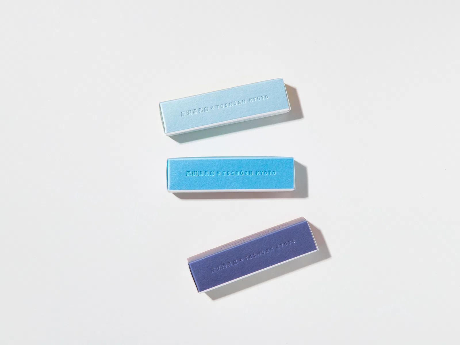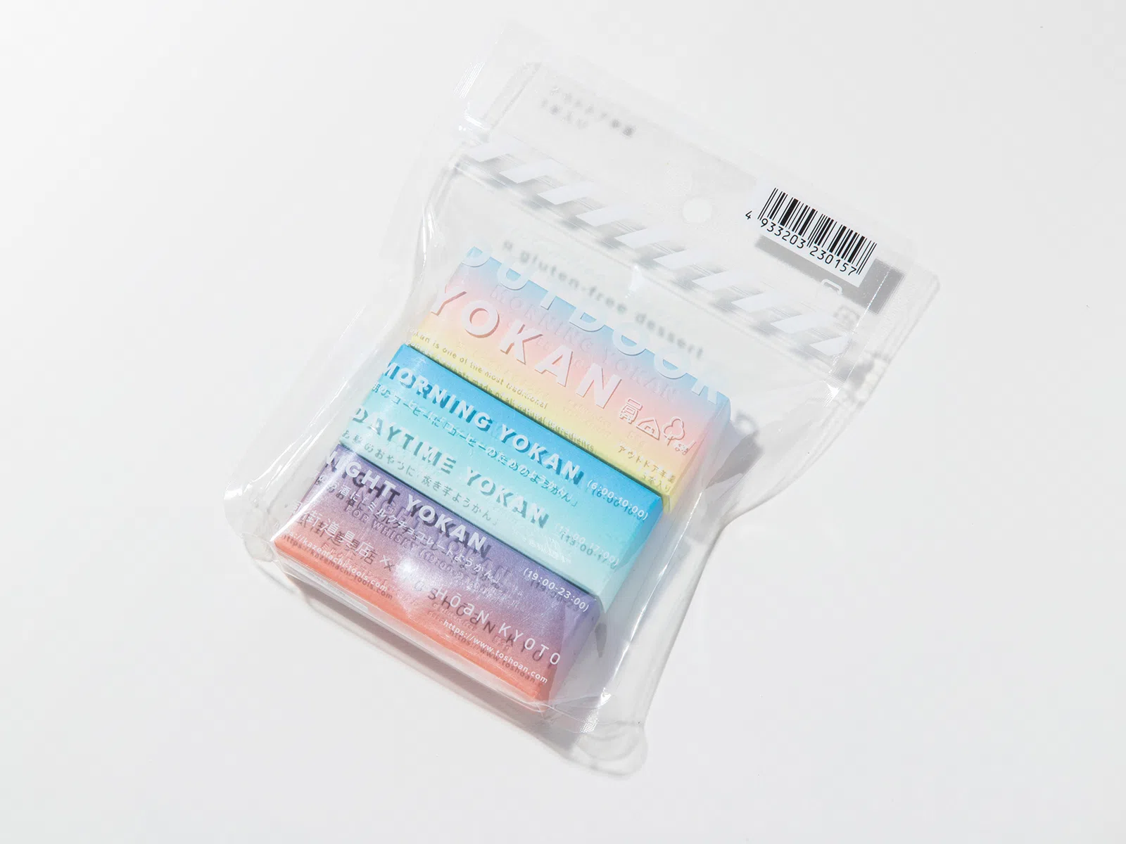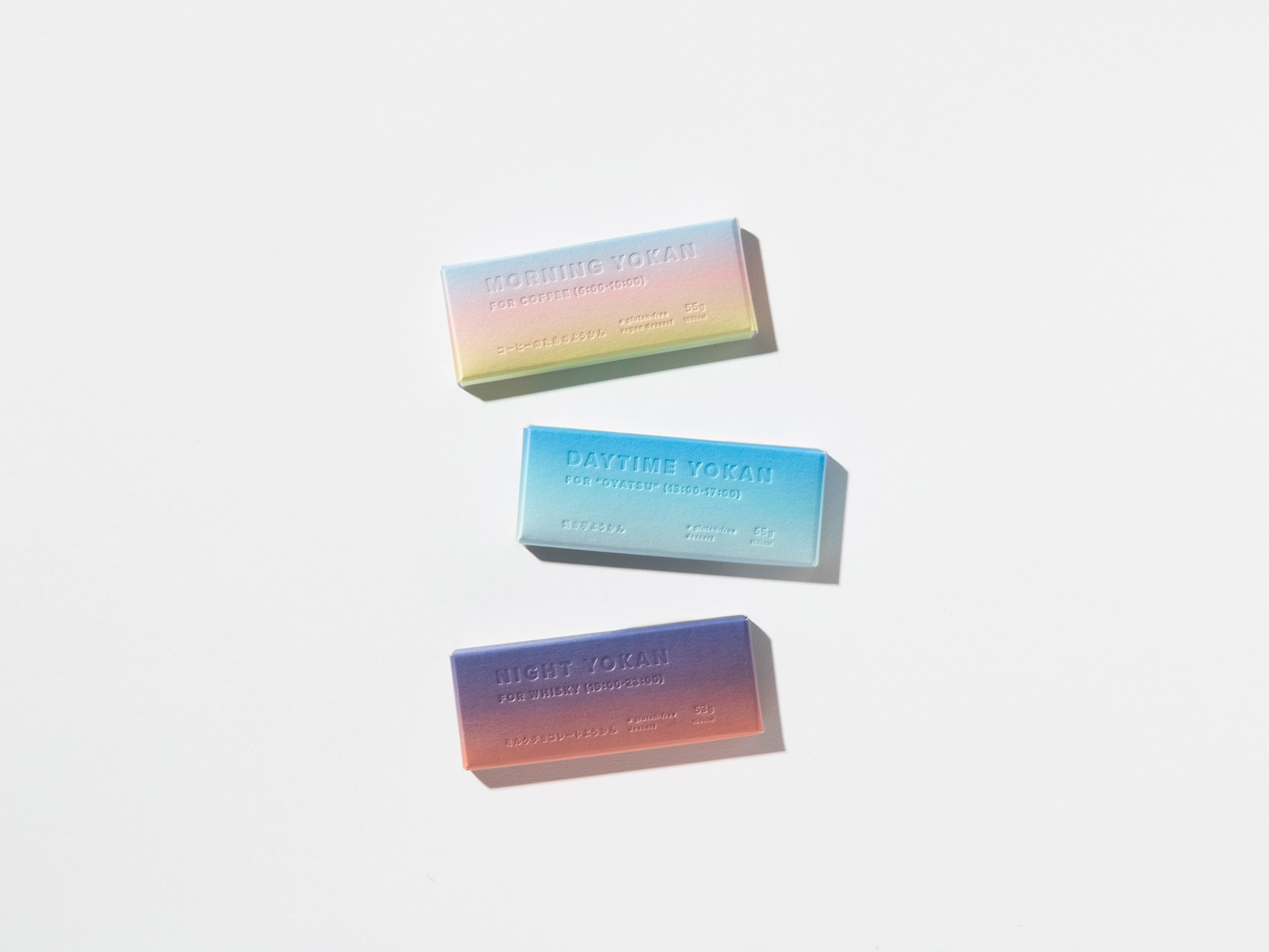 注目を浴びている「アウトドア」。その際に気軽に持って行ける羊羹を提案し、商品化しました。アウトドアで過ごす「時間」に着目し、時間帯の「空の移り変わり」をグラデーションで表現。デザインのポイントは空の色を綺麗に表現すること。そして商品テキストが空の色の邪魔をしないようにインキをのせずデボス加工を用いる点。その2つのポイントを可能にする「気包紙 C-FS」を採用しました。(サノワタルさん)