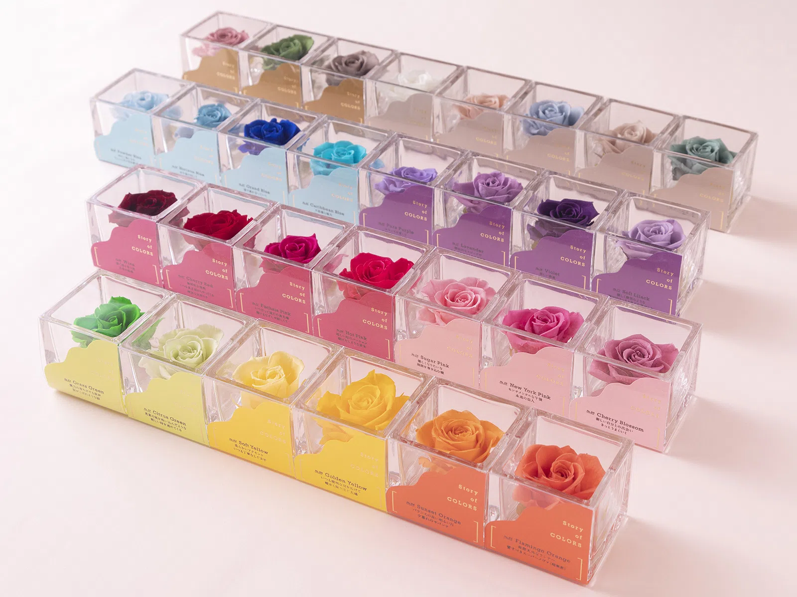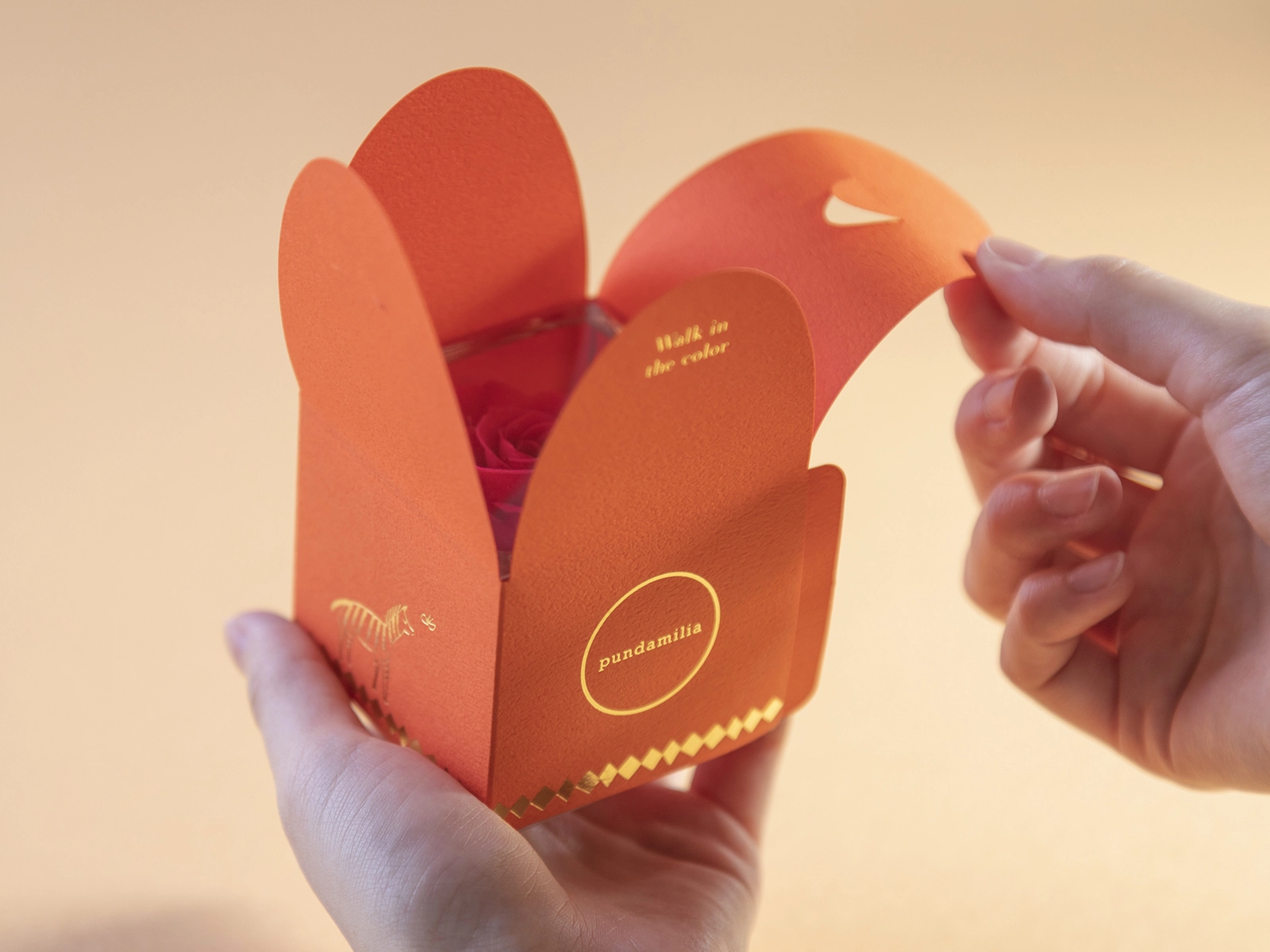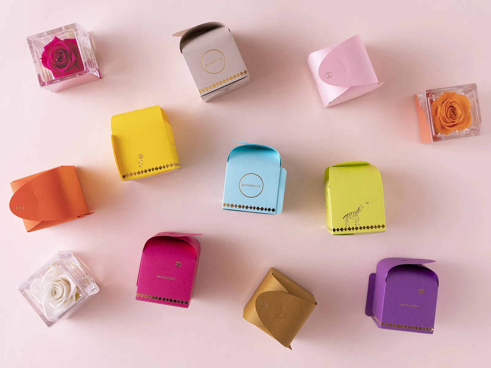 pundamilia(プンダミリア)さんは、プリザーブドフラワーを使った遊び心のある魅力的な商品を沢山作られているお花屋さんです。今回Neki inc.では、その中でも沢山の色展開があるバラの花をガラスキューブに収めた商品「Walk in the color」のパッケージデザインを担当しました。