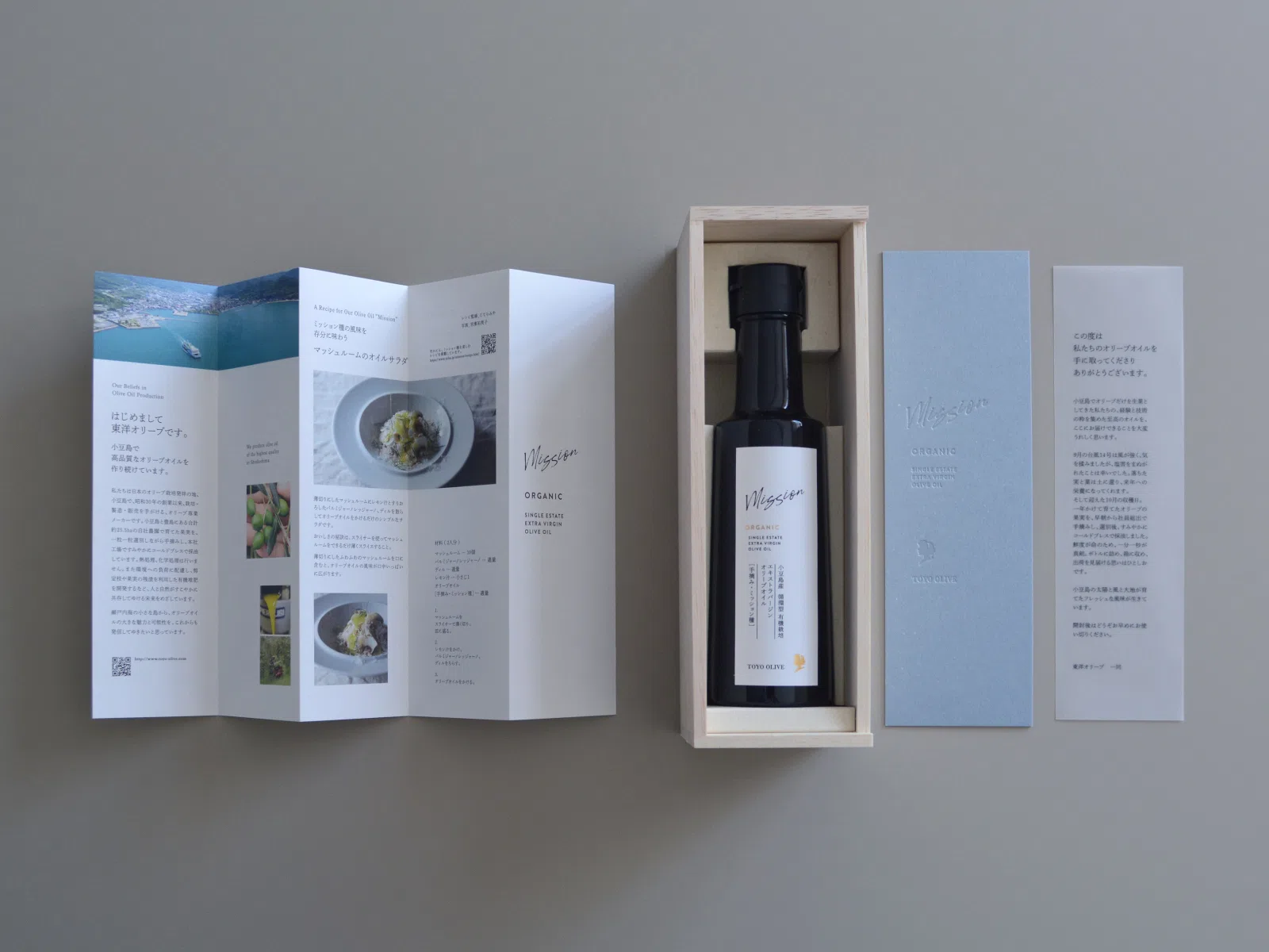 小豆島で循環型 有機栽培に取り組まれ、有機認証を受けた限られた区域の実から採る希少なオリーブオイル。このオイルの特別さや鮮度・美味しさのための背景を伺いながら打ち合わせを重ね「外装には木箱を」と方向性が決まりました。そこから仕様を具体的に固めていくなかで、大切な贈り物や自分へのご褒美として特別感のある佇まいだけでなく、循環型 有機栽培の土づくりにかかった年月や、小豆島という風土、海、風、季節や天気、そこでオリーブオイル作りに携わる方々の人柄なども込められないかと試したなかで、木製の身箱に「GAファイル ブルージーン」の蓋という素材違いの組み合わせがとてもしっくりくると感じ、ご提案しました。
