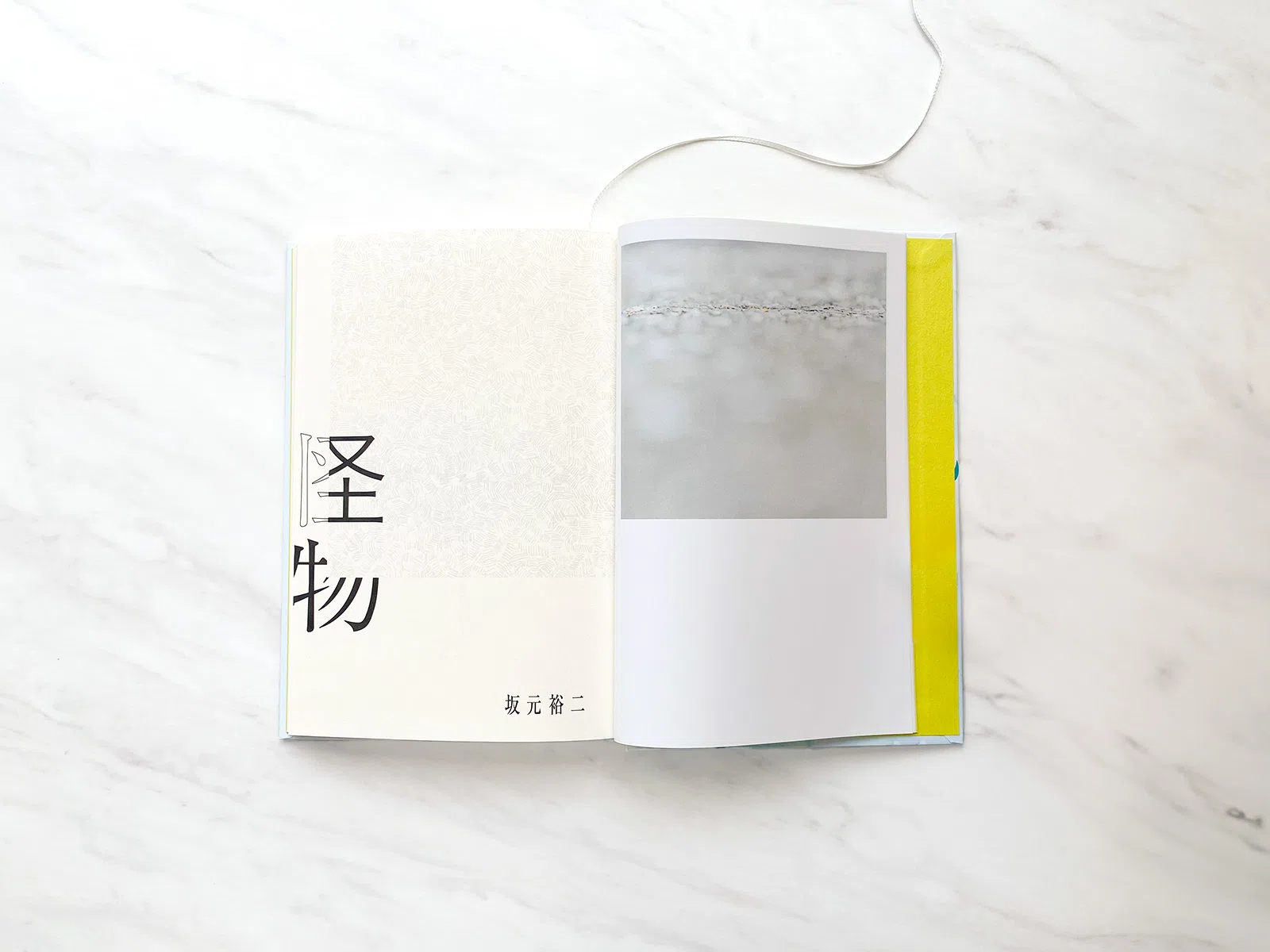 カバーには、本作の象徴的な美しくも荒廃したワンシーンの風景カットに、3つの表情が異なる題字タイトルのデザイン。表紙には、一見綺麗で不穏なマーブリング模様を配しました。用紙は、本作でも描かれる画用紙のような触感豊かな風合いと優れた印刷適性を持つ「アラベール-FS スノーホワイト」。加えて、周りの白に反射する見返しとして若いタンポポの様なエンボス質感の「タント F-60」を使用しました。本文ノド奥には“怪物”のテキストも潜ませ、それぞれの違和感の作用を忍ばせつつ総じて光が差し込むような装幀を意識しています。(石井勇一さん)