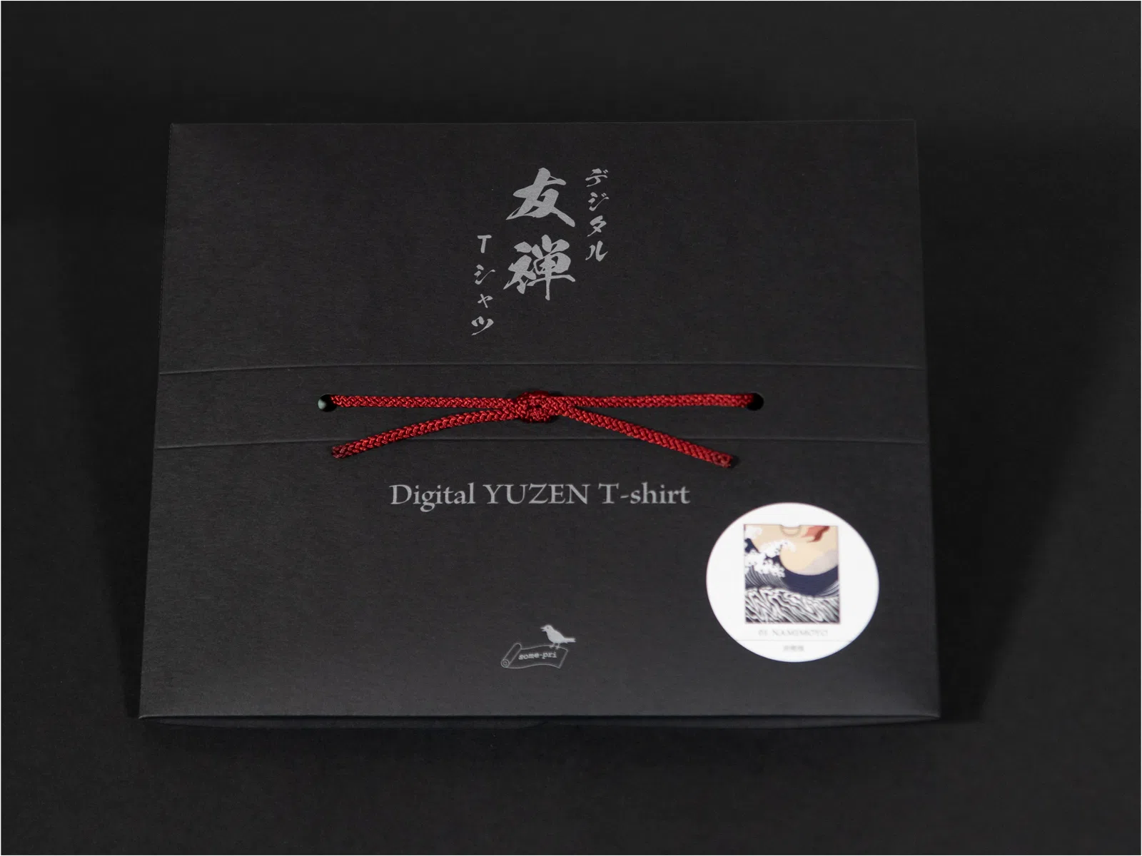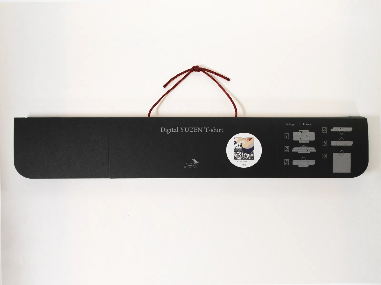 友禅職人による精緻な筆致を堪能できるプロダクトのパッケージとして、「気品がありプロダクトを引き立てること」を意識しました。また、着物のゼロウェイストな設計を取り入れたTシャツでもありましたので、パッケージにも「捨てないで使う」という役割を持たせています。「衣紋掛けになるパッケージ」です。そのため商品輸送・衣紋掛けと強度も欠かせません。そして、飾って鑑賞するという美的体験の面もあり、どの柄にも馴染む質感かどうかが最も重視した点です。