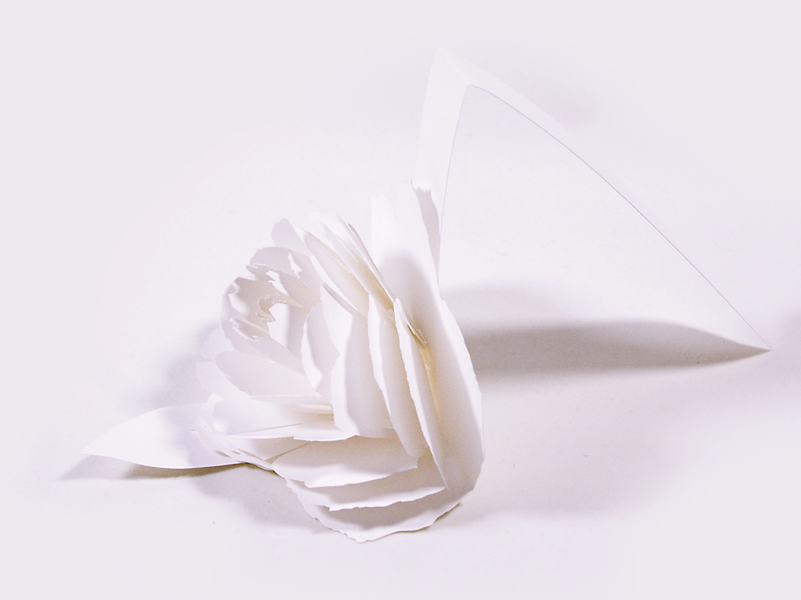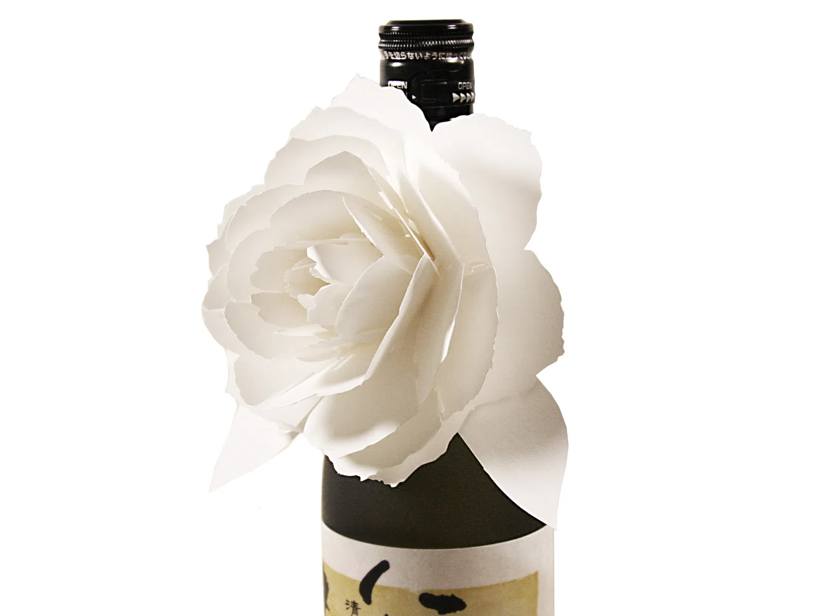 愛媛県、道後の老舗造り酒屋水口酒造株式会社がプロデュースするCAFE BAR&ショールーミングストア道後一会にご縁をいただき、商品化した「紙の花の瓶飾り」です。お祝い事やハレの日には欠かせない日本酒。瓶に咲く白い紙のバラが、特別な日を演出します。瓶飾りは閉じた状態からポップアップカードのように開き、瓶に付けることができます。44個の紙のパーツを手作業で組み合わせてバラの花を表現するため、しなやかな強度のあるアラベール-FSを選びました。(三好祐一さん)