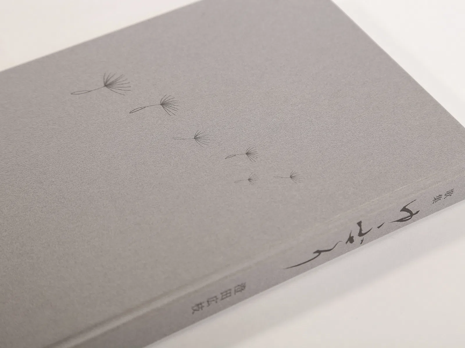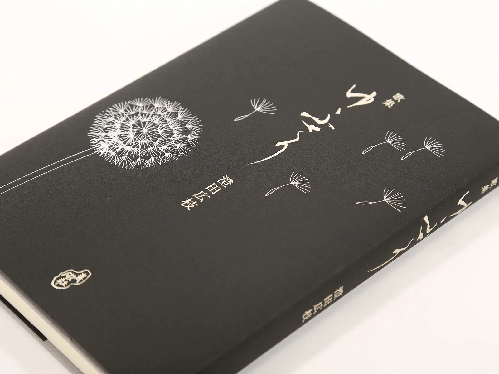 草がぎっしりと絡まりあっているかのようなエンボスを持つ紙なら箔が際立つはずと、「い織り」を選びました。「い織り」の黒にタンポポの線画をホログラム箔で押すと、針金細工のような硬質な綿毛に仕上がりました。書名は箔の種類を変え、やわらかく光るシルキーシャンパンを使用しています。本を傾けると、それぞれの箔で光り方が違います。