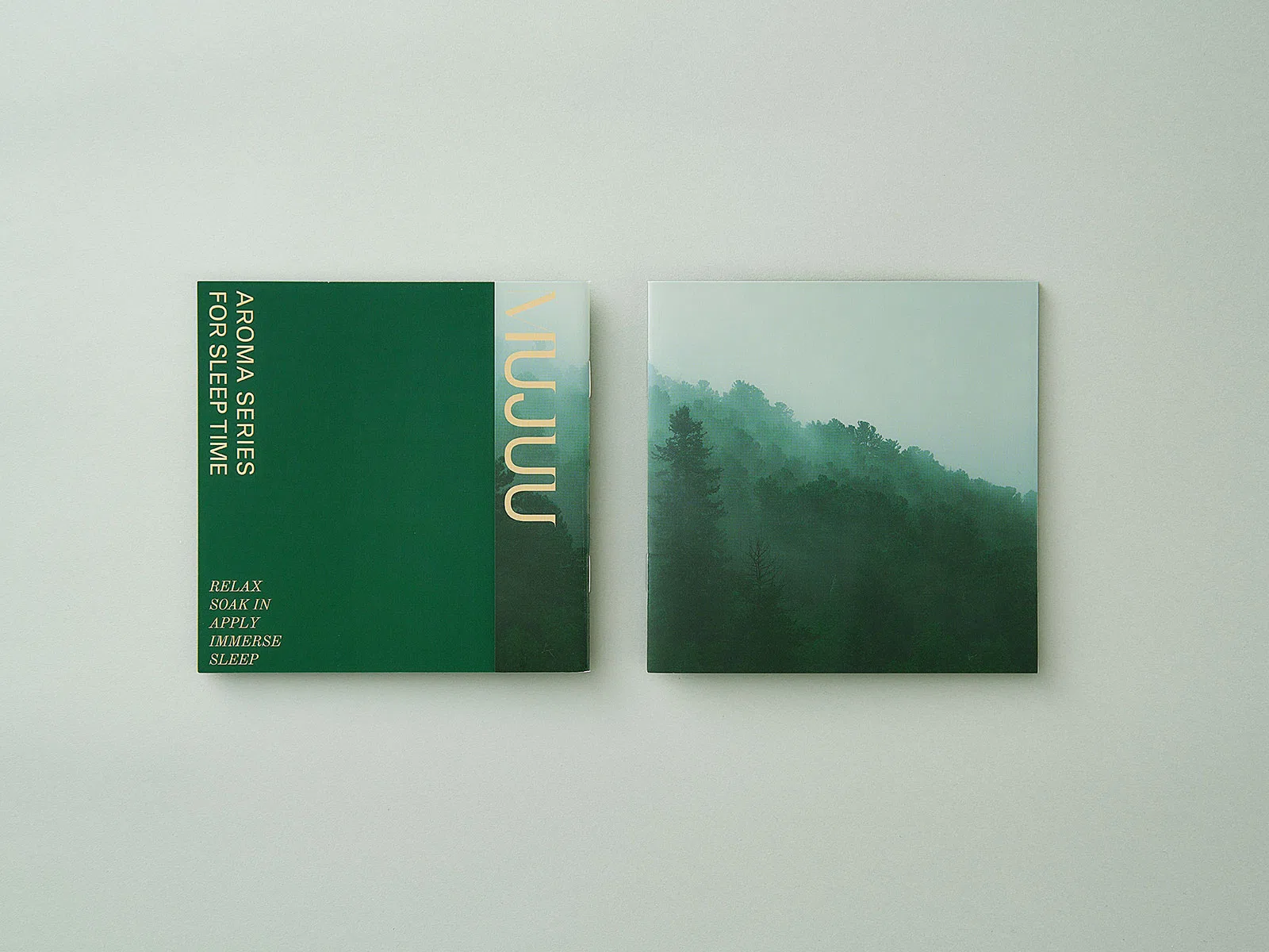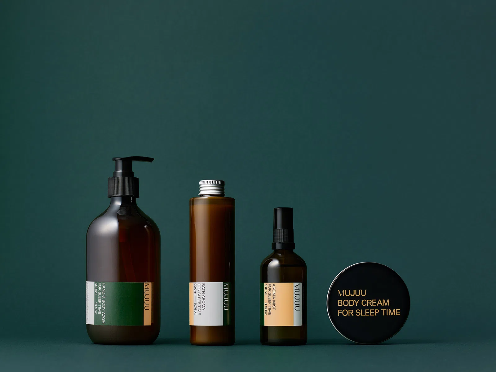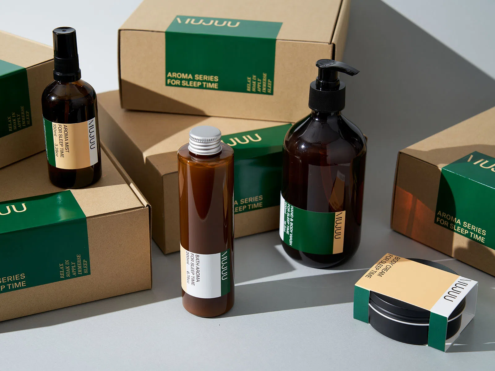 「MUJUU(ムジュウ)」は、忙しい人の睡眠ケアのために生まれたアロマブランドです。一日のおわりに頑張った自分を香りで労ってあげる。そこに寄り添うデザインはできるだけ削ぎ落としたものにしたいと考え、ブランドの顔つきをマークやパターンではなく、配色でつくっていくことに。膨大なスタディを重ね、森林のような緑と、日の光のような淡黄色、そして白の3色を選びました。4つのプロダクトを並べると、色が繋がるよう設計しています。
