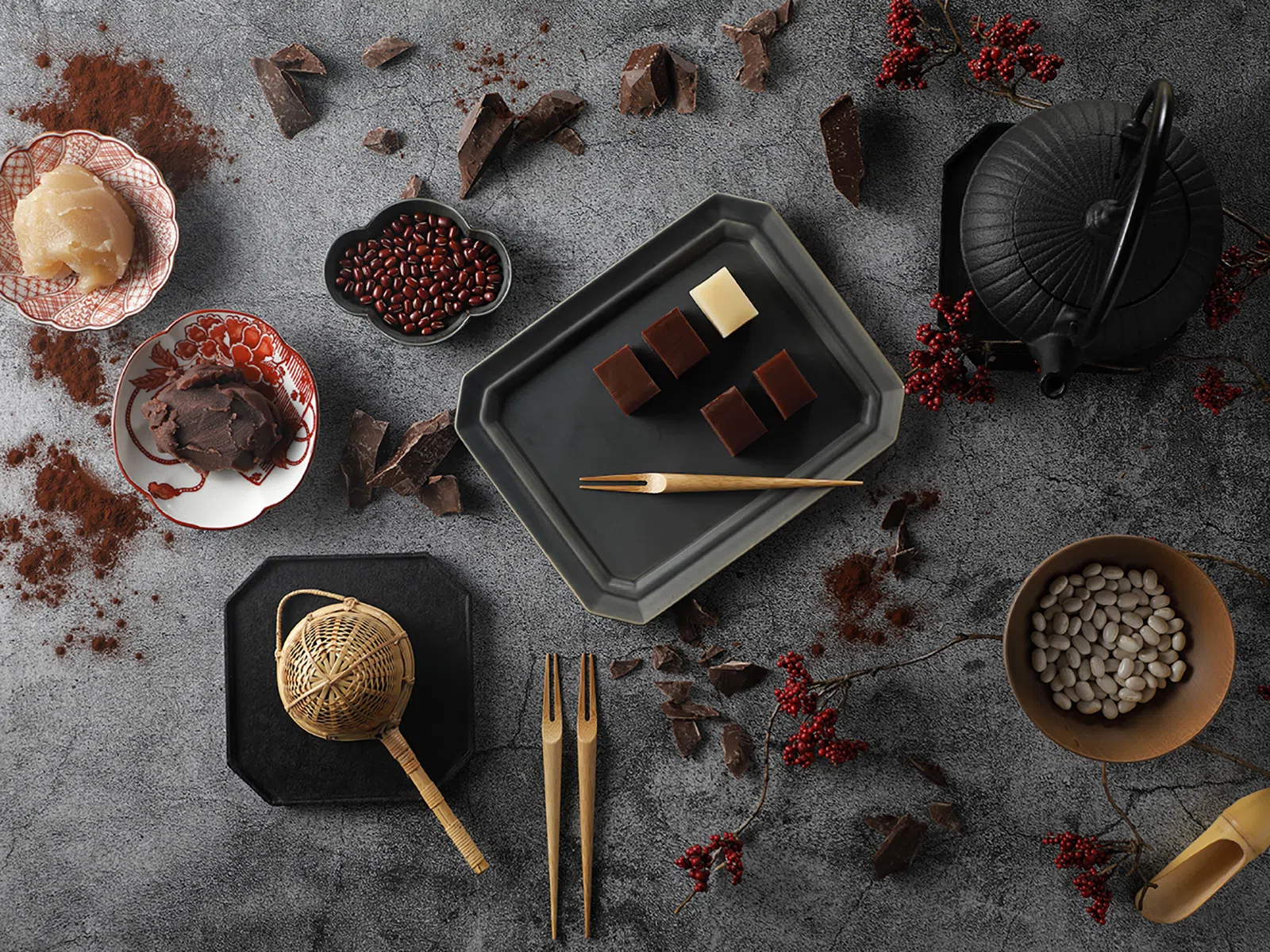 やわらかで繊細なアロマ。デリケートなカカオテイストにフローラルなニュアンスが感じられ、餡の後味も楽しめるダーク・クーベルチュールです。