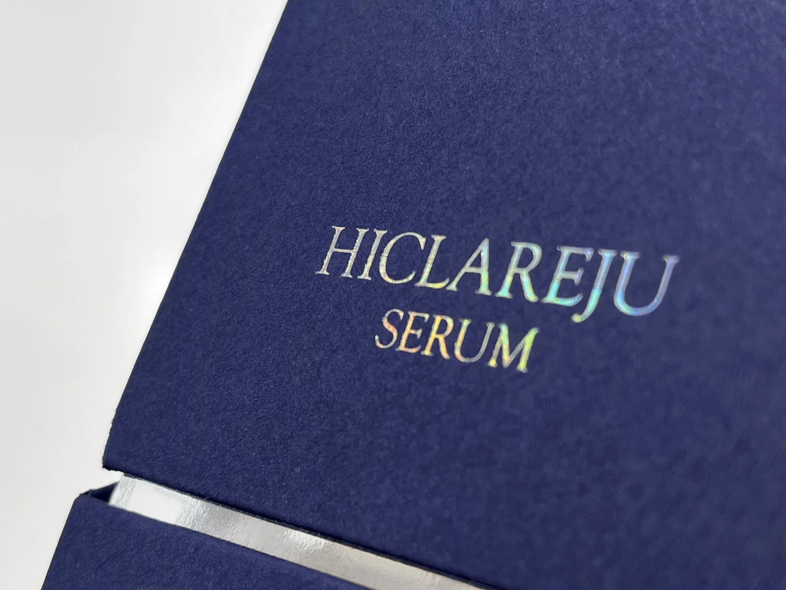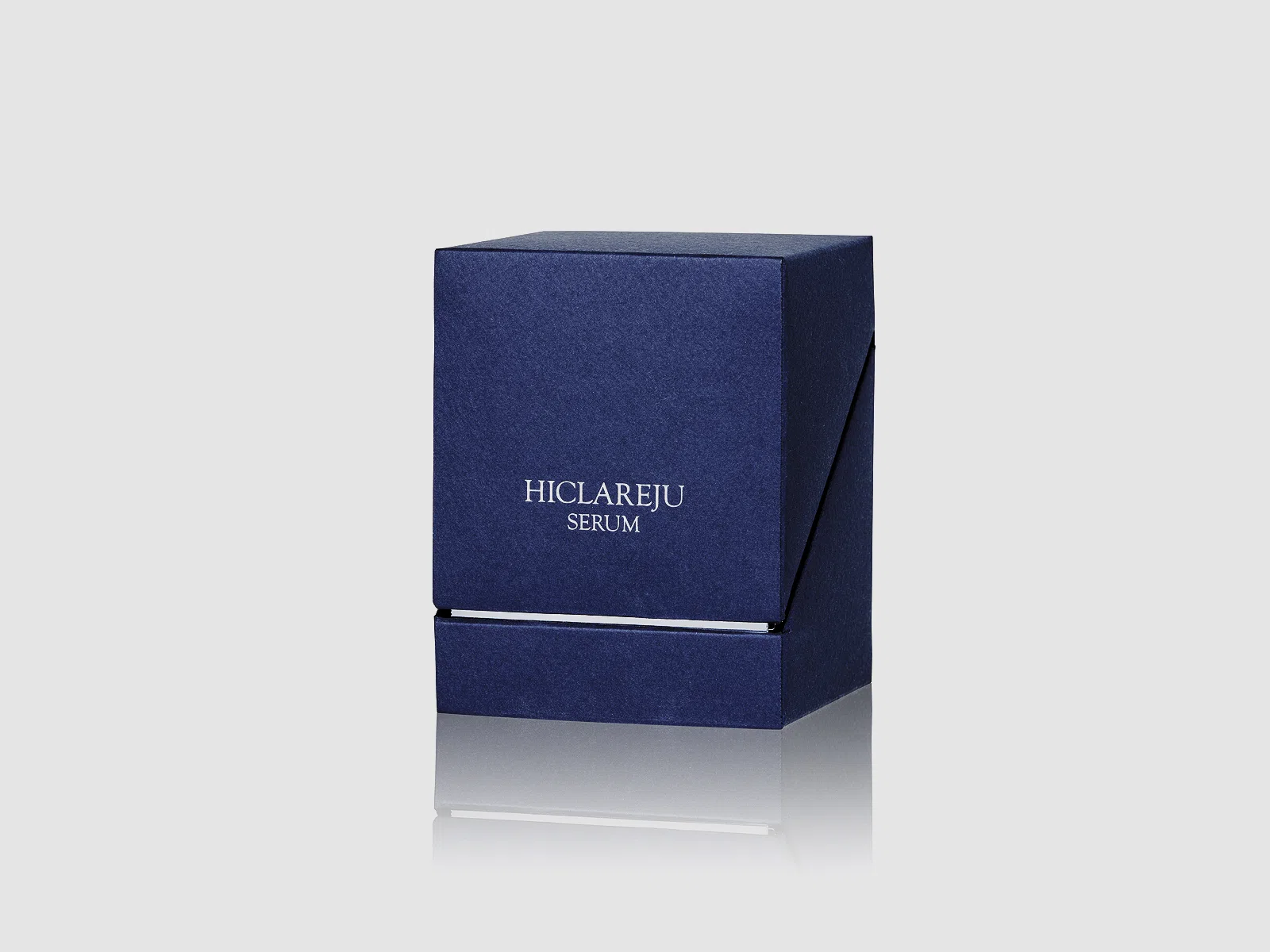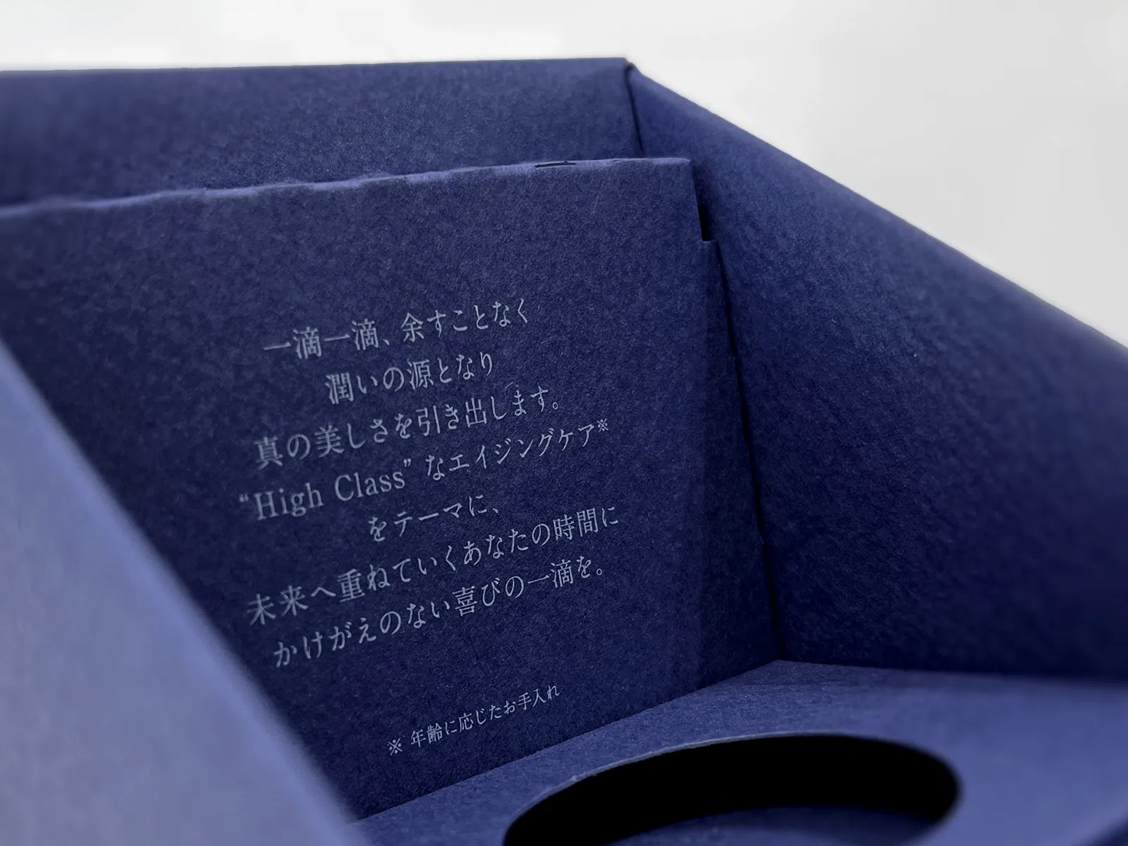今までブランドパッケージとして使用していた紙が入手困難となり、他の紙を探す必要がありました。条件としては「ブランドカラーの色紙」と「組箱にできる厚み・耐久性がある」こと、「コストを維持できる」ことでした。 手元にあるミニサンプルから候補を探しつつ、パッケージ制作会社さんとの打ち合わせを重ねていくと、ブランドカラーである「ネイビー」に近しい紙がほとんどなく、最も近い色味が「マーメイド-FS 深海」でした。そこで淀屋橋見本帖に伺い、いろいろと相談をさせていただきました。その中で、「マーメイド-FS」を使用した製品見本や、ツール類を確認させていただけたことが、採用決定に繋がりました。 「マーメイド-FS」のラフで柔らかい質感に落ち着いたネイビーの色味、ホログラムの箔押しと内側のシルバー蒸着紙とのコントラストによって、容器との親和性が得られました。本製品のテーマが“Gift”であり、手に取った時の期待感や箱を開けた時のトキメキ・驚きといった、贈り物の演出に「マーメイド-FS」ならではの質感と存在感が大いに寄与してくれたと思います。(植竹真也さん)