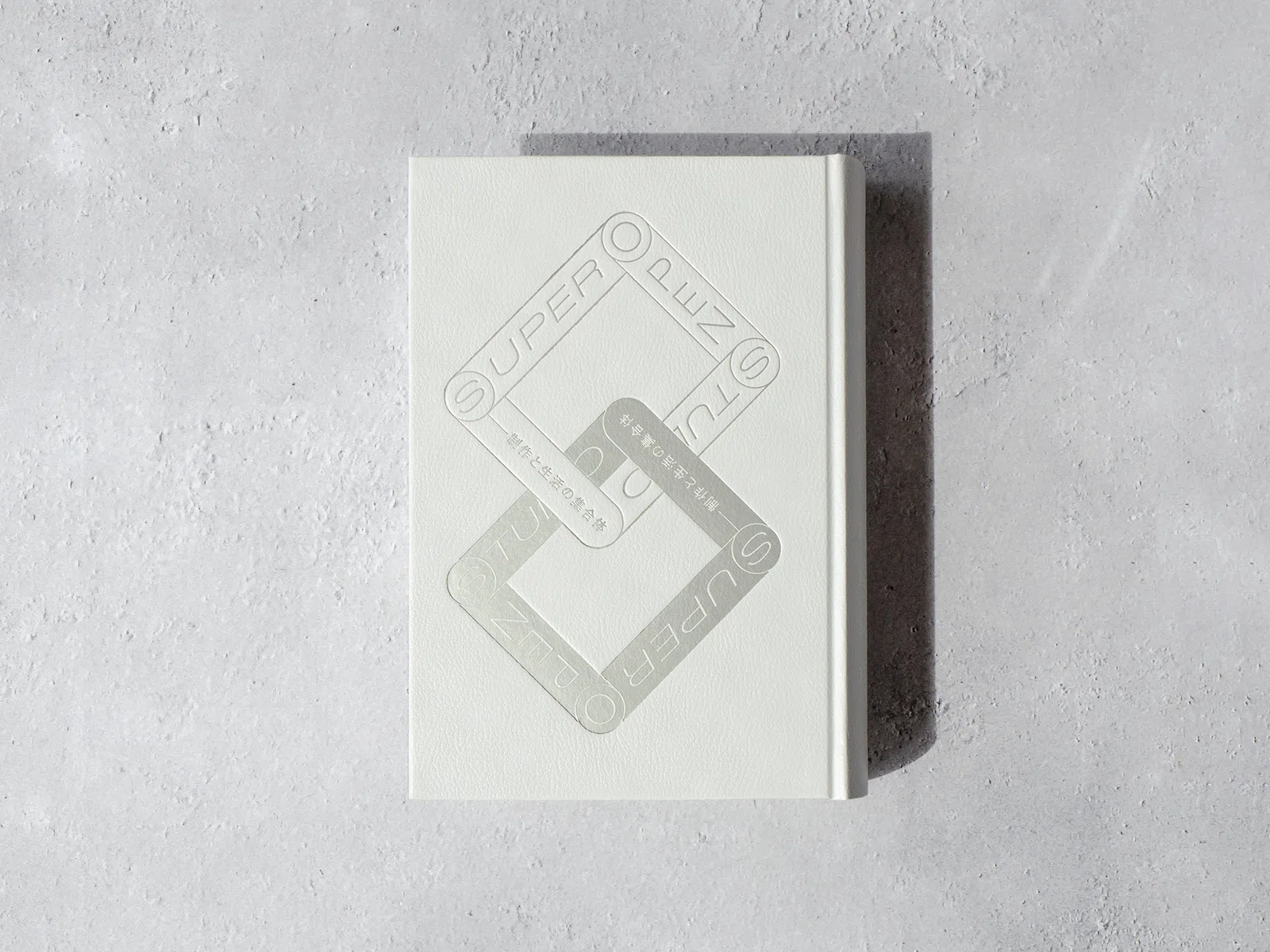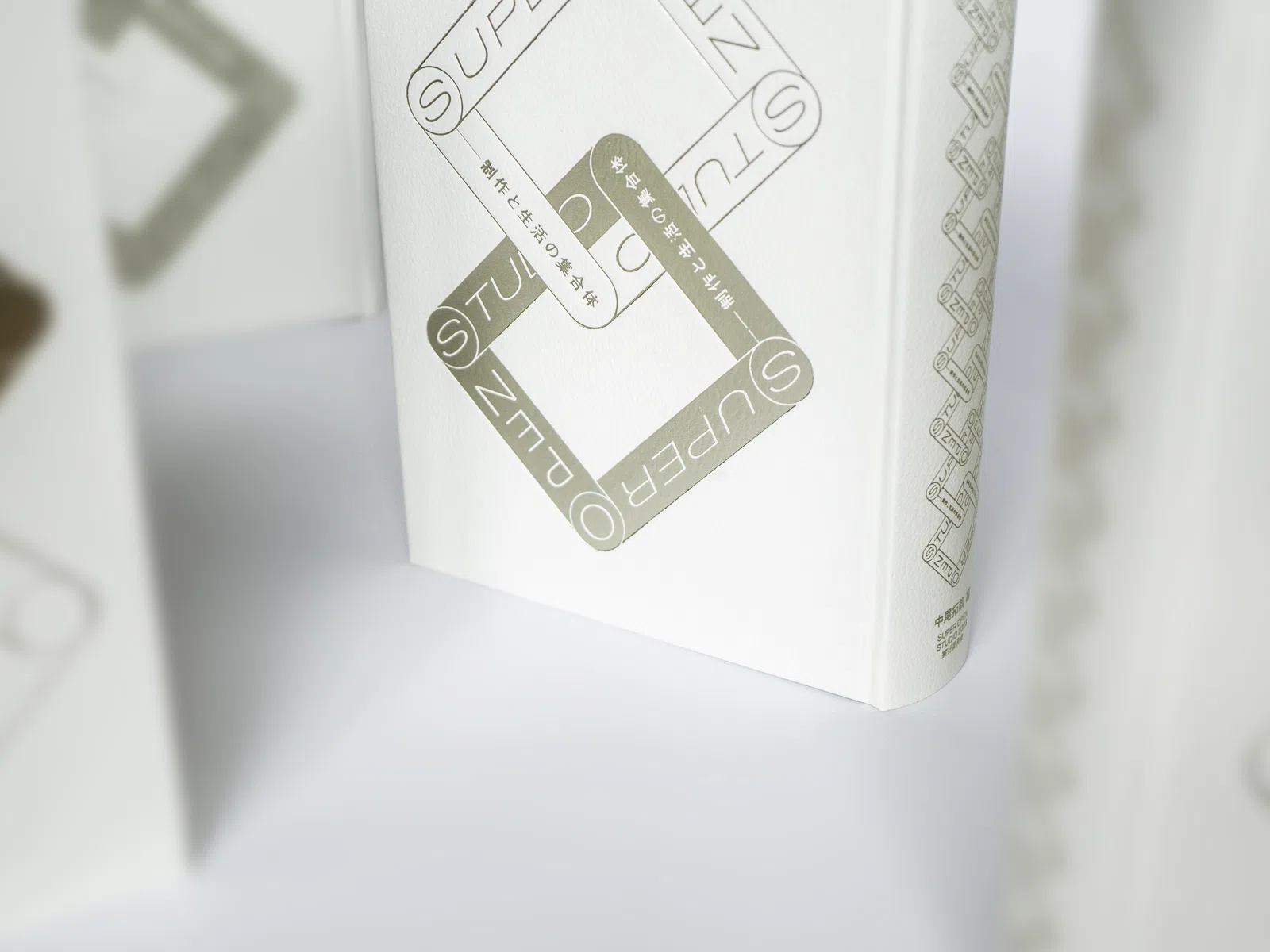神奈川県相模原市(及び東京都町田市・八王子市の一部)にて活動する20軒を超えるスタジオと、その所属アーティスト約100名から成る「SUPER OPEN STUDIO NETWORK(S.O.S.NET)」。「スタジオ」という制作場所が近くにあることから始まった「S.O.S.NET」は何らかの方向性を共有したコレクティブではなく、文字通りネットワークであり、アーティストの数だけの異なる思考が飛び交っています。2013年より開始された、年に一度複数のスタジオを巡ることができるオープンスタジオ「SUPER OPEN STUDIO(S.O.S.)」の記録とともに、スタジオ、アーティストの活動をまとめた本です。10年の活動を1冊にまとめた本とのこともあり、手にした人が永く資料として残したくなる(現在永く残されている本の仕様を参考に)仕様を考えた際に、革の質感を持つ「メルテックス GRC」に行き着きました。紙色は中立性を感じる色味として白を選択し、箔色もシャンパン系の淡い色味とすることで、クラシックな質感と同時に軽やかで現代的な仕上がりを目指しました。カバーの「エアラス」も同様に、しっかりとした印刷再現性がありながら軽やかさも感じる点で選択しています。表1、背、表4にある意匠は彼らの関係性「繋がっていく」「続けていく」ことを象徴的に表現しています。(松田洋和さん)