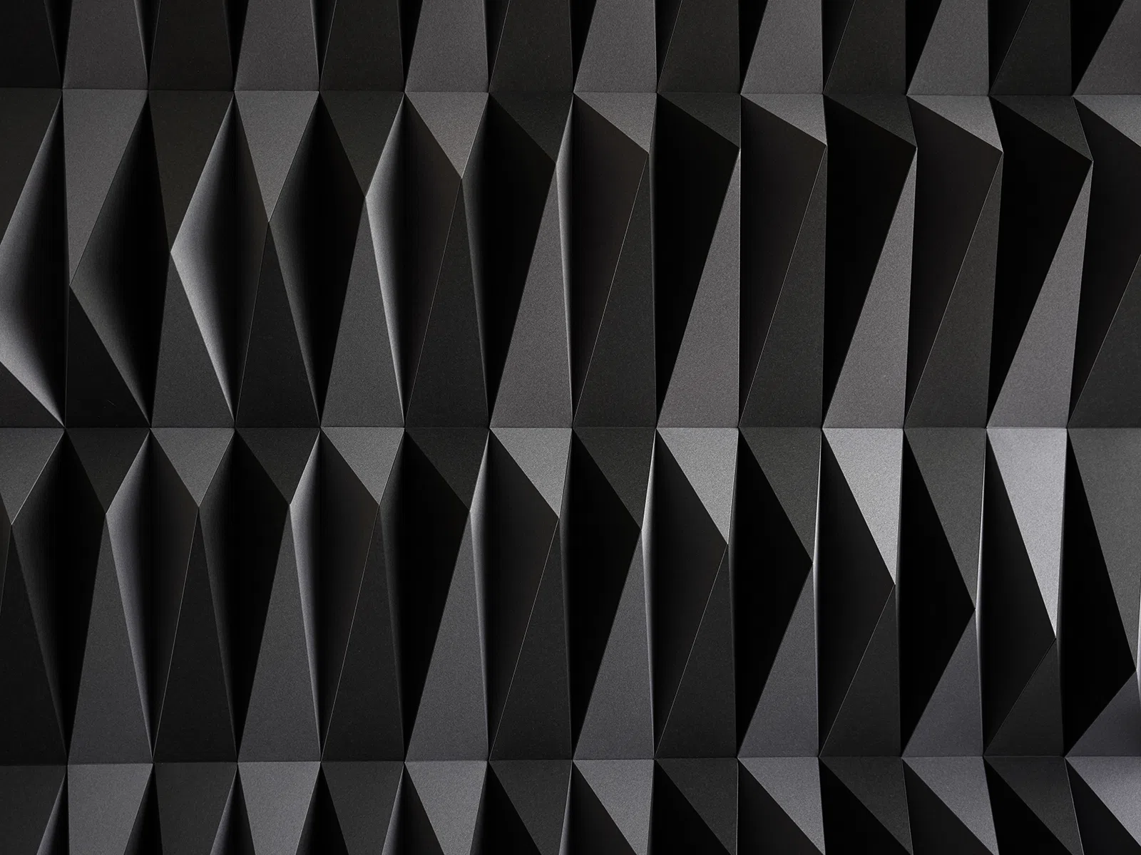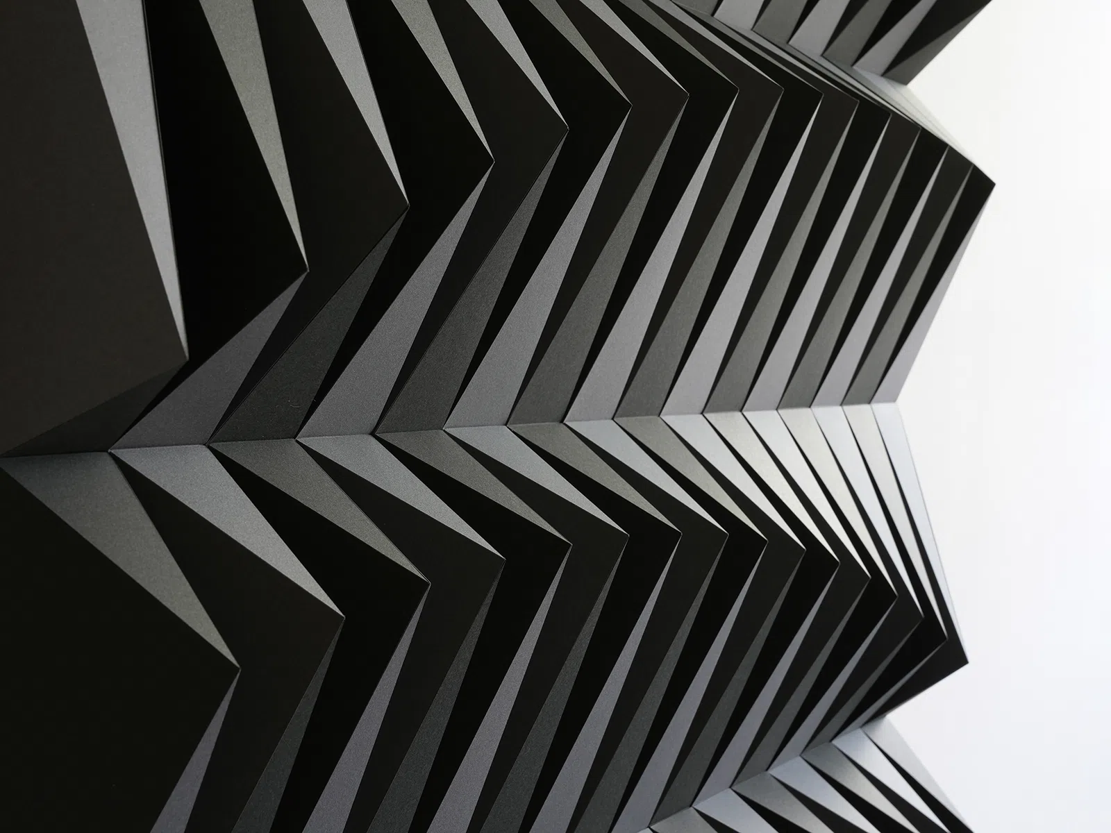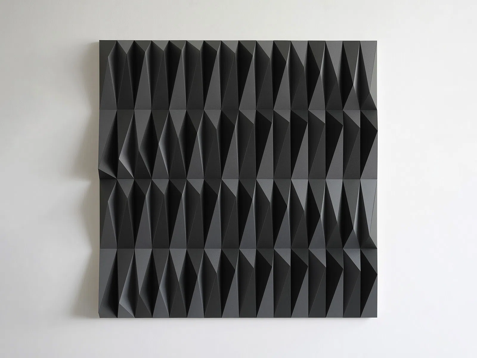 「NTラシャ」はフラットな質感でありながら光の反射は柔らかく、ソリッドな形を表現しても無機質になりすぎないところが気に入っています。今作は暗さの近い2種類の紙(黒とグレー70)で構成した四角錐をユニットとし、頂点の位置を徐々に変化させて連続的に並べています。光に対する面の角度がそれぞれ異なることによりグレーの階調が増幅し、本来の紙色と見た目の明暗関係にところどころ逆転が生じます。「NTラシャ」はグレーの色調にも豊富なラインナップがあるため、この効果を引き出すのに最適な組み合わせを見つけ出すことができました。(上浦佑太さん)