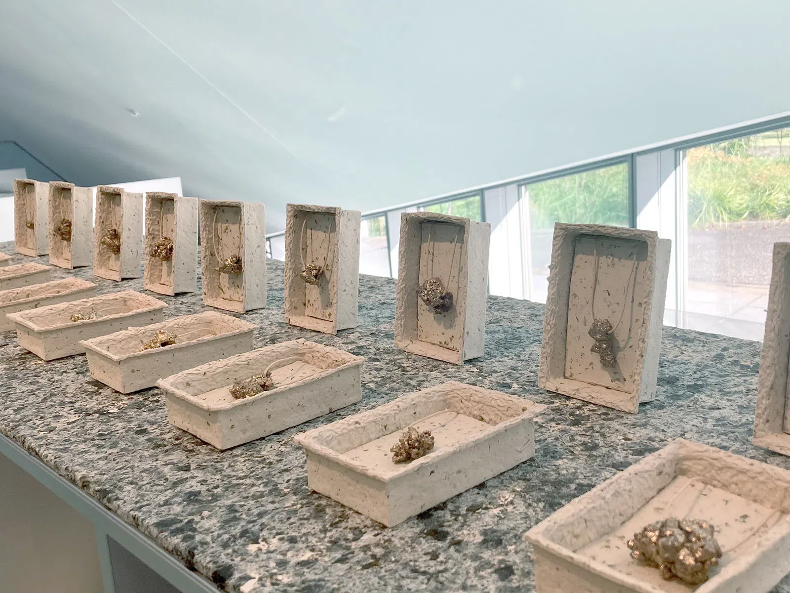 “jewelry from earth”は、ミミズの糞塚で出来ています。ミミズの糞塚は糞であると同時に、ミミズが地中から排出した土の塊です。それらは土なので、焼成するとそのままの形で陶器になります。表面の金色の輝きは、本物の金を使用していますが、高価な金も糞塚も起源を遡ればどちらも地中です。日常に生物の痕跡が溶け込み、自然が作ったかたちを愛でる瞬間が生まれないか、という試みでもあります。