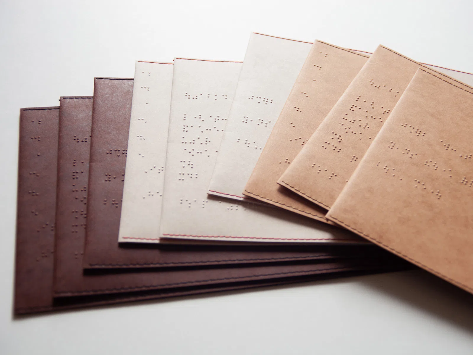 「Braille Book cover」には読書している最中にも、言葉を指で感じられるような位置に点字のエンボス加工を施しています。最初に制作したブックカバーでは、日本点字図書館の創設者である本間一夫氏の著書『指と耳で読む -日本点字図書館と私-』から一節を抜粋しています。《見える目を持つ幸せ 自由に読書できる喜び 本間 一夫》と打っています。この言葉に出会ったとき、読書をする中で文字を目で読めること、文字から知識を得られることは幸せなことであり、喜びでもあると改めて感じさせられました。デザイナーという自身の創作活動においても見えること、見えないことについて考えさせられ、大きく影響を受けました。現在、「Braille Book cover」では、本間氏の他に石川倉治、ヘレン・ケラー、アンネ・フランクの言葉を抜粋して制作しております。(鳥尾佳佑さん)