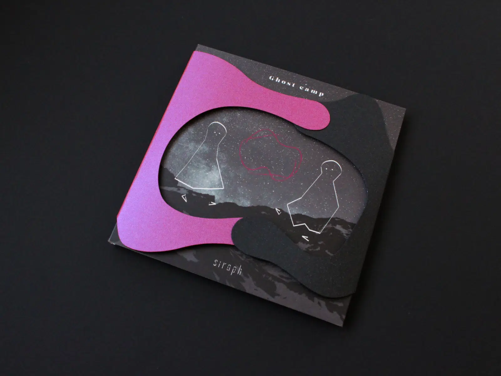 siraph(Annabel、蓮尾理之、照井順政、山﨑英明)の3rd mini album『Ghost camp』のCDジャケット。Ghost(おばけ/魂)が手を取り合い、楽しくキャンプをしているような表現を、煌めき感のある「リアクション-FS」と「ミランダ-FS」を組み合わせた特殊スリーブで表現しました。(草桶 開さん)