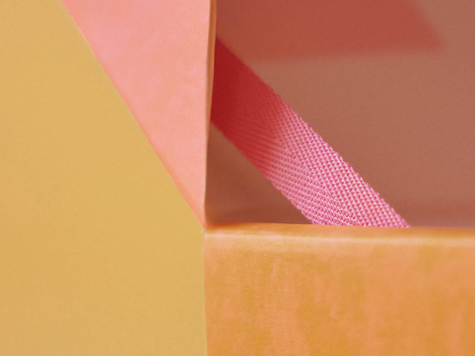 オフセット5色印刷(4色+特色蛍光ピンク)、刺繍加工、抜き、ヒンジ箱(リボン付き)