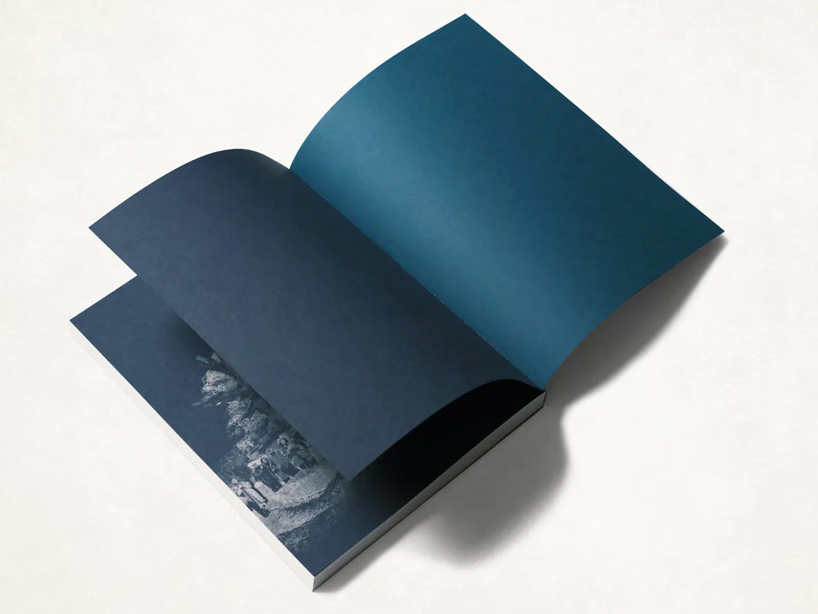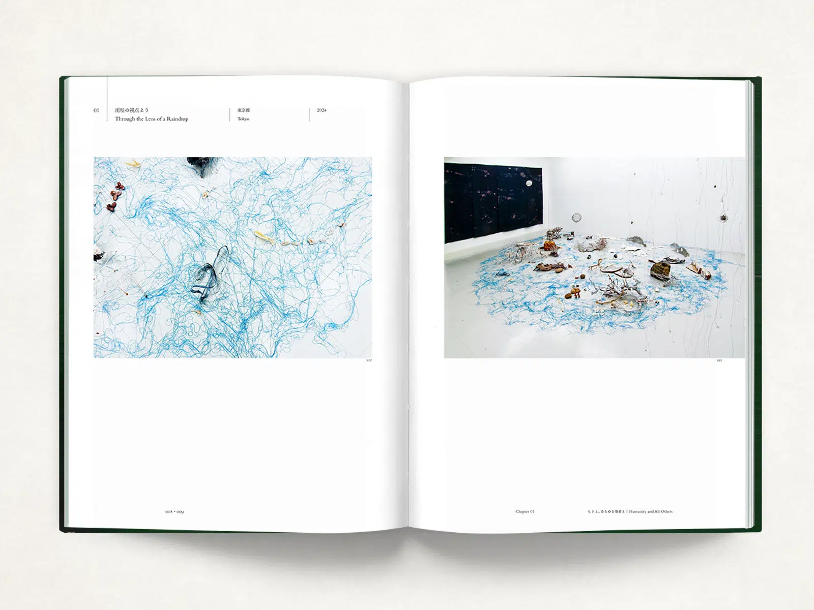 アーティスト 丸山芳子さんの40年以上にわたる活動の作品集・活動記録集です。インスタレーション、絵画、交流プロジェクトなど、ジャンルにとらわれず活躍されているため、表紙デザインは特定の作品などを使わずにタイトルのみのシンプルなものにしました。このようなデザインの場合は、紙の力が重要になります。今回は、作品のイメージに近く印象深い色をもつ「グムンドカラーマット-FS No.91」を選択しました。表紙の色味と相性のよい見返しの「ビオトープGA-FS ネイビーブルー」は銀インキの発色も抜群です。背にあるクータ部分の「NTラシャ」は僅かしか見えないながらも存在感のある色を選びました。(橋詰冬樹さん)