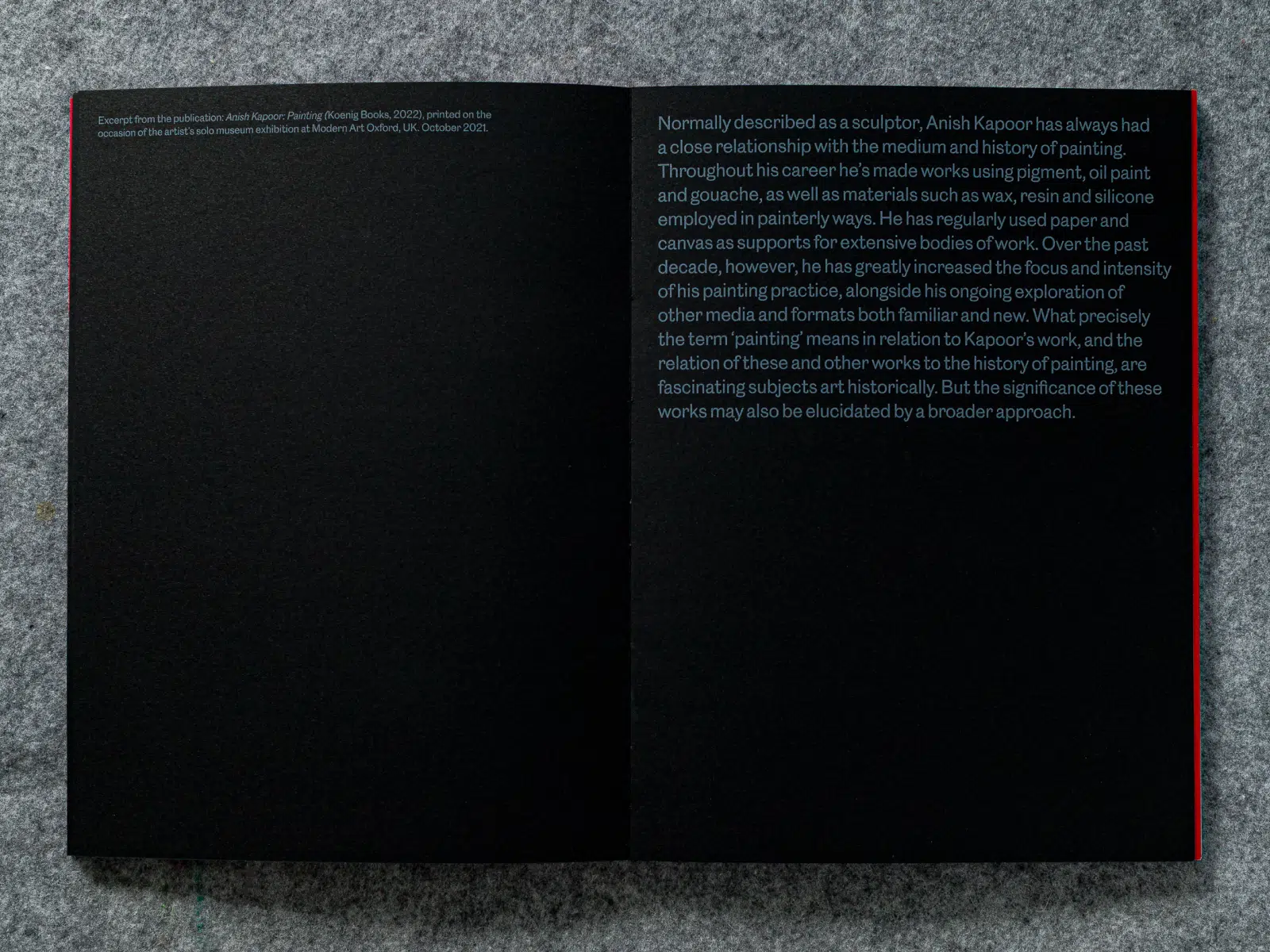The brochure accompanies Anish Kapoor's first solo exhibition with Lisson Gallery Shanghai. Long celebrated as a sculptor, Kapoor has recently received acclaim for his paintings—a longstanding but previously seldom-seen strand of his practice.