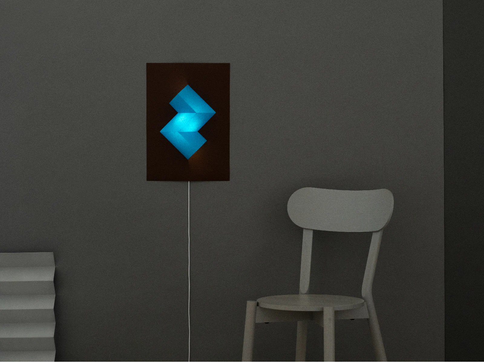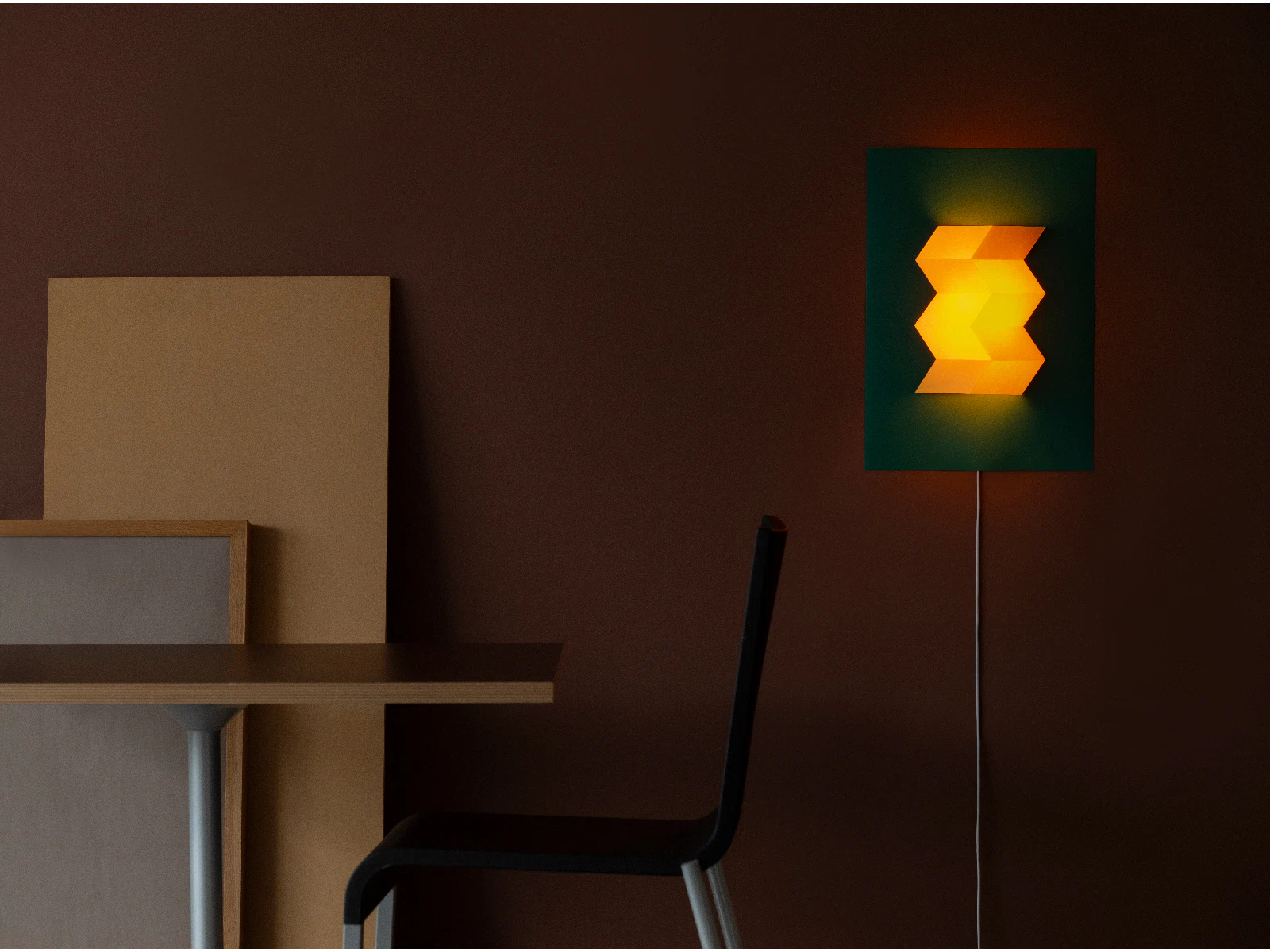 紙だからできる、山折りと谷折りでできた幾何学立体のライトです。昼は立体の生み出す陰影、夜は鮮やかな紙の形と色を生み出します。形と色の力で、部屋が楽しくなる照明を作りたいと考えました。鮮やかで、プロダクトとして成り立つ強度があり、折った際にエッジを綺麗に表現できるため、今回の紙を使用しました。シェードに使用している「マーメイド」は、ライトを点けた時に、紙が優しく透過するため、紙の色を活かした照明を作ることができました。光っている時も、光っていない時も、部屋を楽しく照らします。(本山真帆さん)
