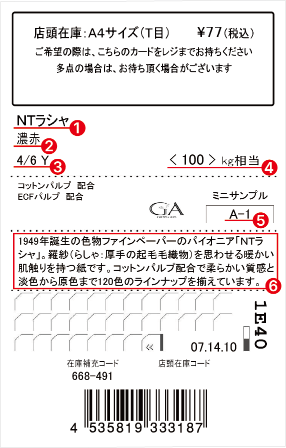 A4サイズでご購入いただける商品と同じ厚さの紙に様々な情報を記載したものです。