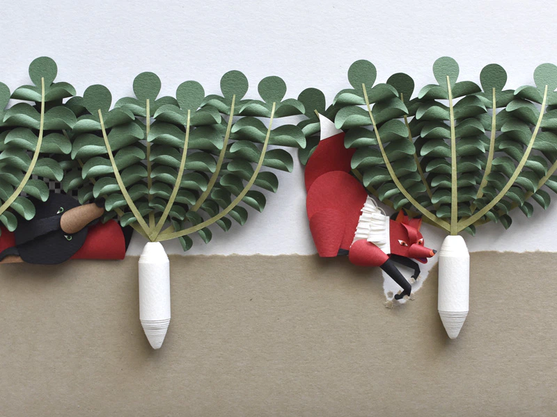 動物の毛並みは、羊皮紙や里紙などの独特な表情のある紙で表現。